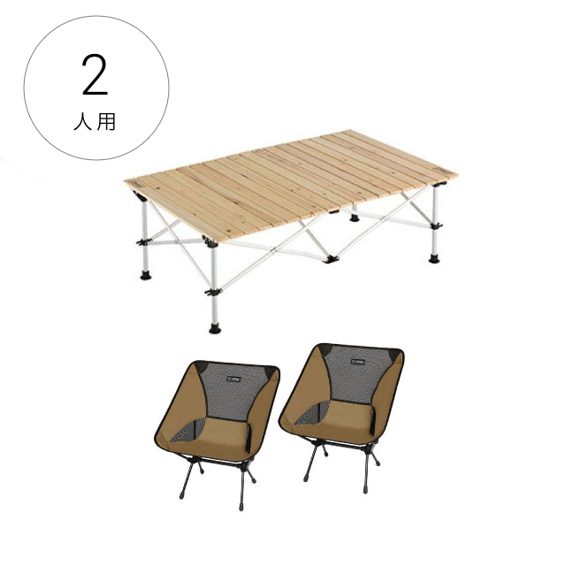 Low(ロー)タイプのセット。ナチュラルロールウッドテーブルとチェアワンとの組み合わせです。ロースタイル(※1)にオススメなセット。コンパクトにまとまるので持ち運びも楽々。フェスなどでの利用には最適なセットです。